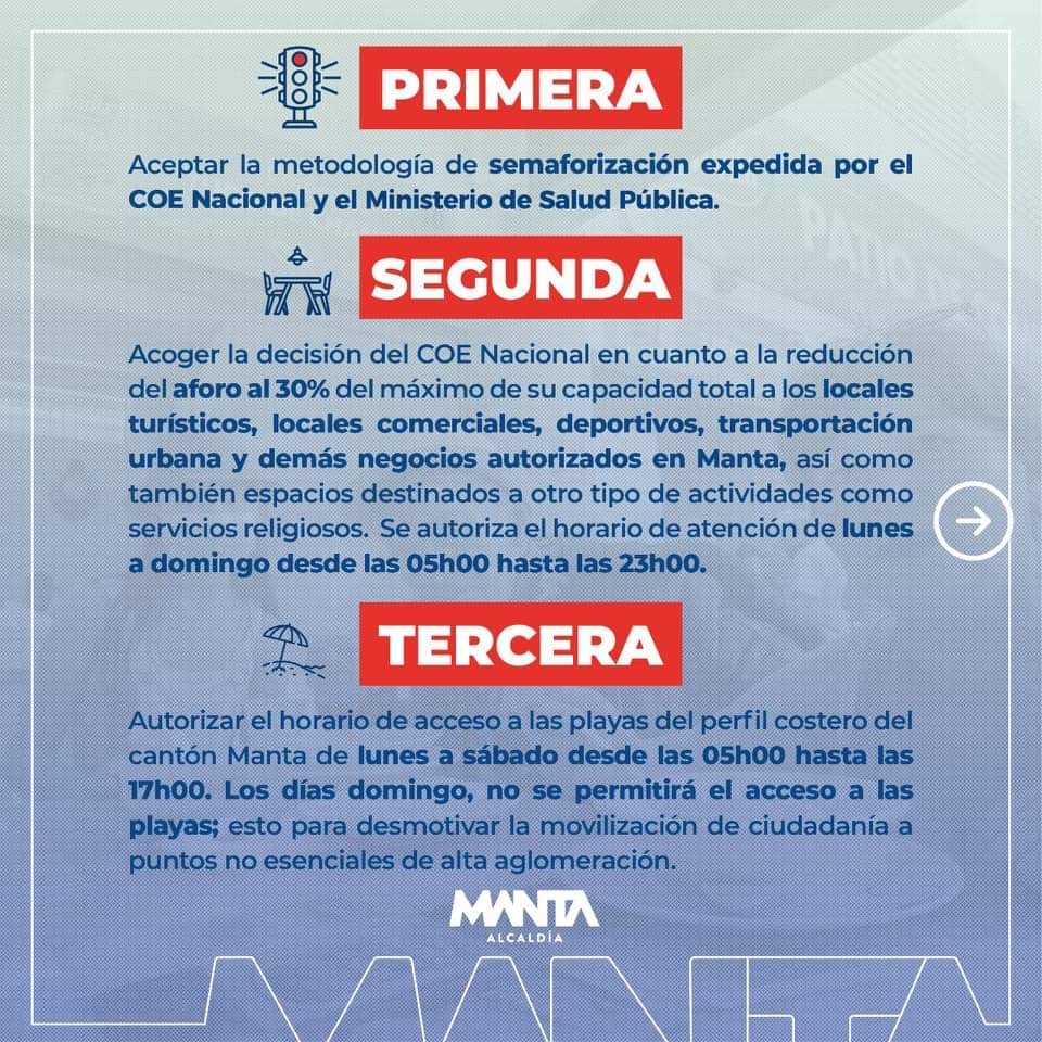 El COE cantonal de Manta dispuso que, las playas marinas, solo podrán ser visitadas entre las 05h00 y las 17h00, de lunes a sábados; mientras que el domingo permanecerán cerradas.