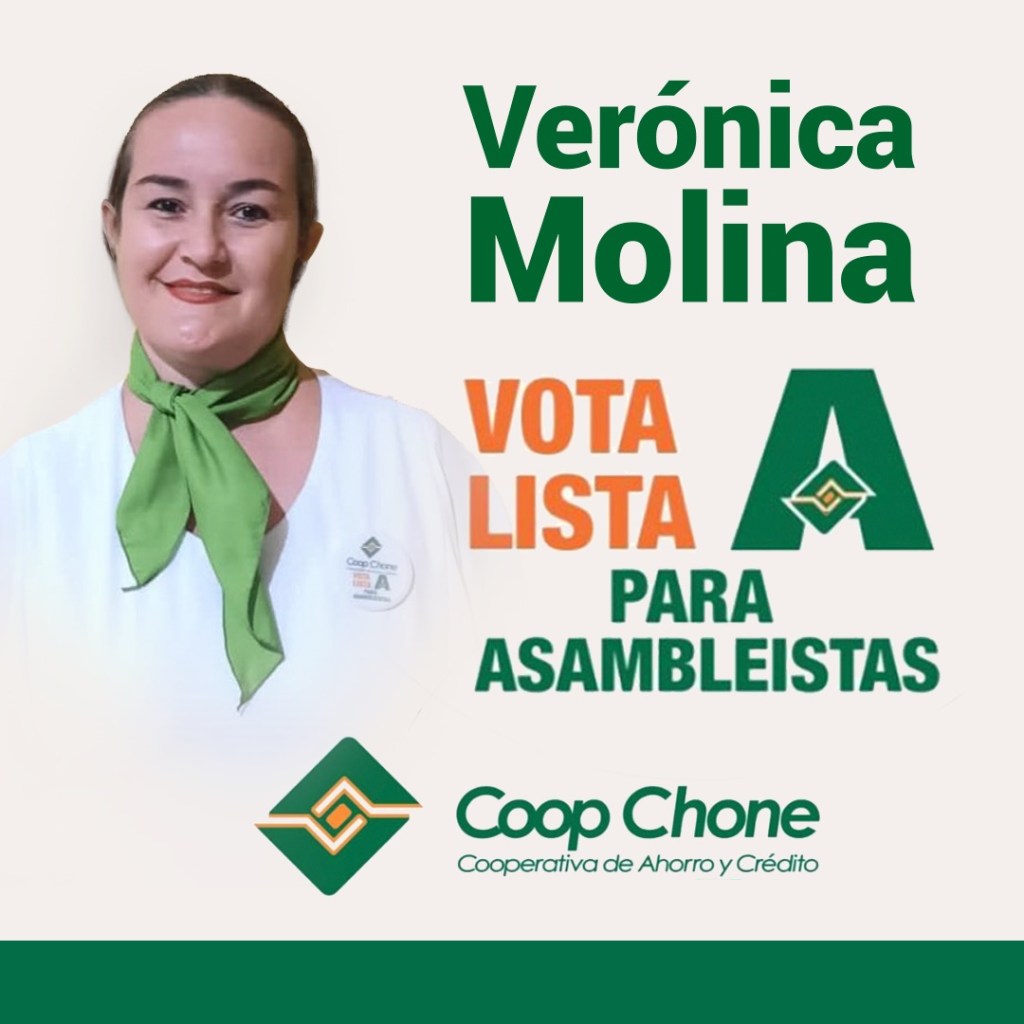 María Verónica Molina Andrade, ingeniera comercial y artesana calificada, es una joven emprendedora dueña de un taller de repostería muy bien acreditado en la ciudad de Chone (Ecuador) donde ella nació y reside. Al ser socia de la Cooperativa de Ahorro y Crédito Chone, Ltda., es una de las personas candidatas a ser elegidas para renovar la Asamblea General de dicha entidad financiera.