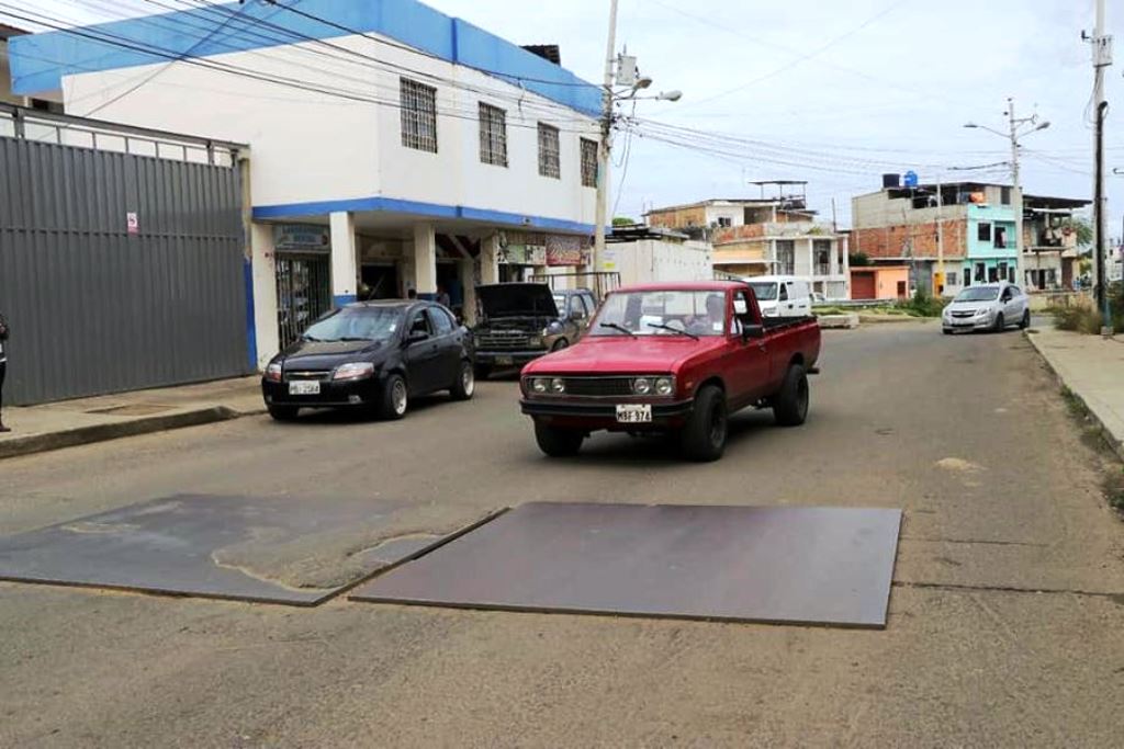 En el sitio se habían colocado provisionalmente unas placas metálicas, para evitar el hundimiento del piso al ducto cajón ubicado a la altura de la Federación de Artesanos y que lleva aguas lluvias hacia la desembocadura del Río Manta.