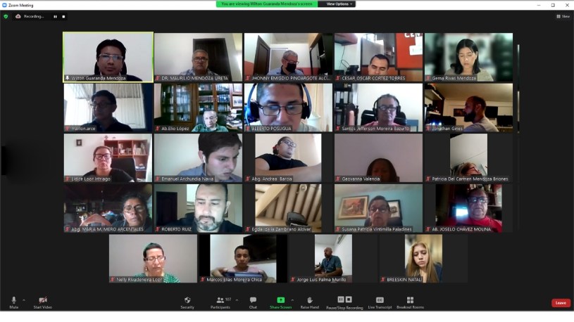 El día jueves 17 de febrero, desde las 17h00, más de 120 abogados en libre ejercicio participaron en el primer conversatorio virtual, el cual estuvo a cargo de Wilton Guaranda Mendoza, juez de la Sala de lo Civil de la Corte Provincial de Justicia de Manabí, quien abordó el tema “Recursos en materia no penal”.