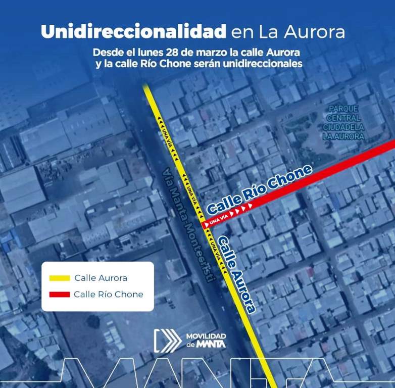 Desde el día lunes 28 de marzo del 2022, las calles Aurora y Río Chone de la Ciudadela La Aurora (Manta, Ecuador) se convertirán en unidireccionales o con tránsito automotor en una sola dirección, para lo cual se hizo un simulacro previo el día viernes 25 de marzo.