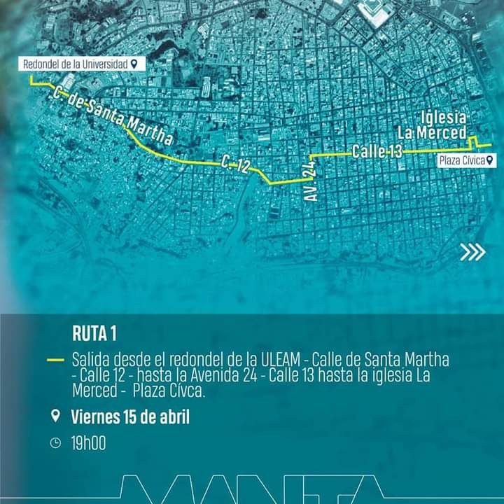 Un viacrucis empezará desde el redondel que distribuye el tránsito próximo a la Universidad Laica Eloy Alfaro de Manabí (ULEAM) en el Barrio Santa Martha, pasando por las iglesias La Dolorosa y La Merced en el centro de Manta, hasta llegar a la Plaza Cívica Eloy Alfaro.
