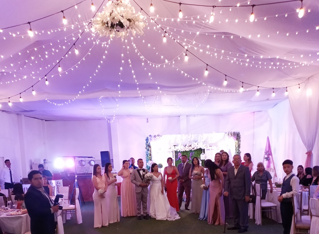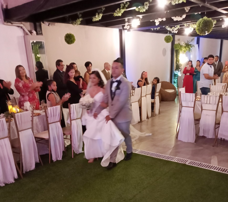 Finalmente, los nuevos esposos fueron a celebrar su casamiento en el centro de eventos sociales Vip Par, hasta donde acudieron sus invitados provenientes de diversos lugares del país y algunos del exterior. Allí hubo una ceremonia de apertura que incluyó el ingreso solemne de los desposados y su corte de honor, continuando después con baile y la actuación especial del Mariachi Juvenil Los Camperos. En el intermedio se sirvió comida y bebida para el placer de la concurrencia.