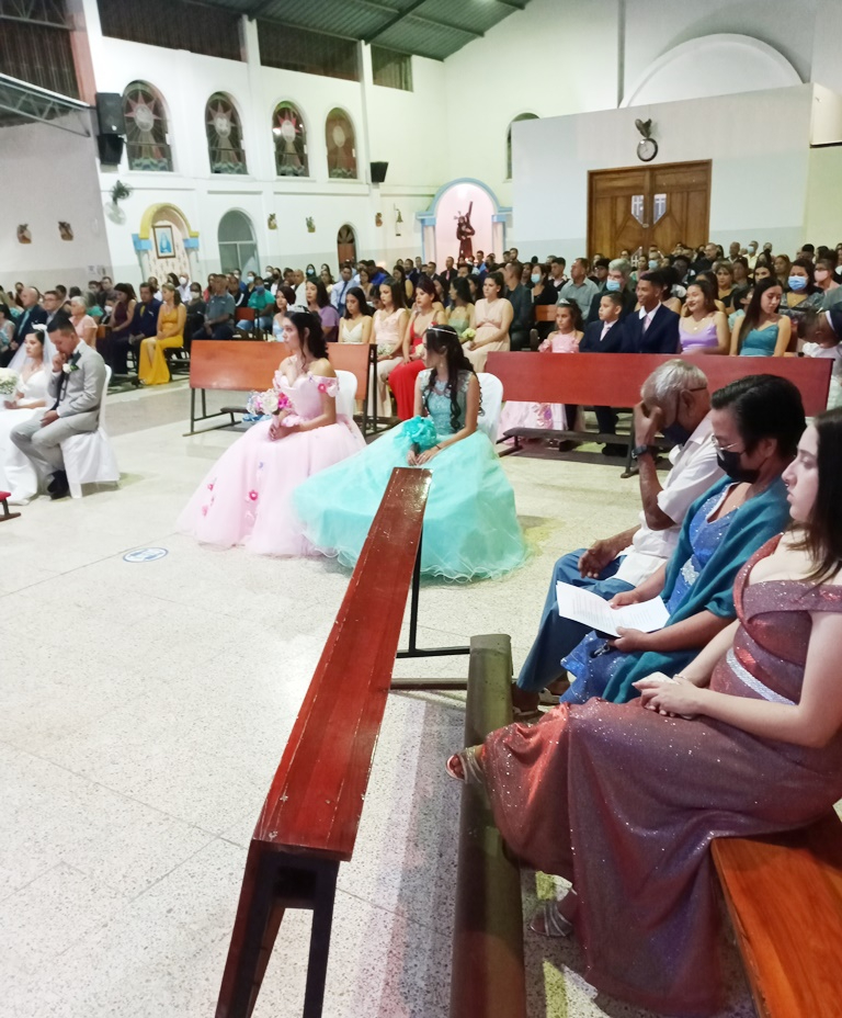 El acto litúrgico tuvo lugar en el templo Nuestra Señora de la Paz, al comenzar la noche del sábado 28 de mayo. Allí se reunieron, además de los feligreses que acuden con regularidad a la misa de las 19h00, familiares y allegados de ambos contrayentes, destacándose las damas de honor Josselyn Zambrano, Lady Laura Bonilla, Tamara Palma, Daniela Caicedo, Kimberly Portocarrero, Génesis Pico y Ana Patricia Rosado; además de la dama de amor Valentina García Rosado, la novia chiquita Renata Amaya Toala Zambrano y el novio chiquito Sebastián Isaías Joza Mancero.