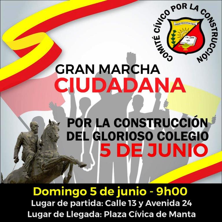 La Asociación de Excinquinos anunció para este domingo una manifestación ciudadana a fin de urgir al Gobierno nacional la inmediata construcción del edificio de la Unidad Educativa “Cinco de Junio”, que así como la de otros colegios y escuelas de la ciudad, colapsaron debido al el terremoto del 16 de abril del año 2016.