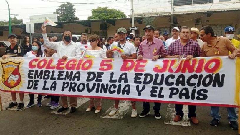 Gritos de júbilo y arengas de apoyo se escucharon al paso de la gallarda banda musical íntegramente conformada por ex estudiantes de varias promociones del “Glorioso”, como se conoce al plantel, hoy denominado Unidad Educativa “Cinco de Junio”.