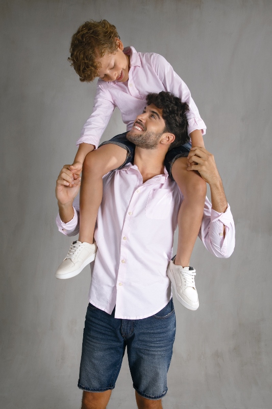 - Si eres de los que te gusta hacer match (juego) con tus hijos, opta por una colección de básicos -tanto de polos como T-shirts– que vienen en una amplia gama de colores en la línea masculina y kids, lo que les permitirá crear looks fantásticos juntos.