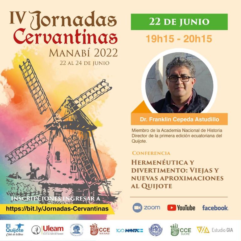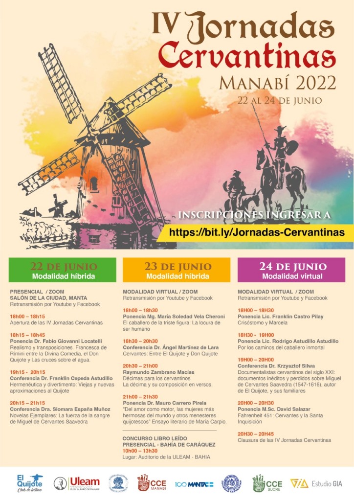 | 23 junio Jueves Cervantino en Bahía de Caráquez (Concurso de Libro Leído: Cabalgando entre Historias Quijotescas). 10h30 – 13h00 Presencial (Auditorio de la ULEAM, extensión Bahía de Caráquez). Bahía de Caráquez. 23 junio Conferencias magistrales 18h00 – 21h30 Virtual (Zoom, YouTube, Facebook Live) |