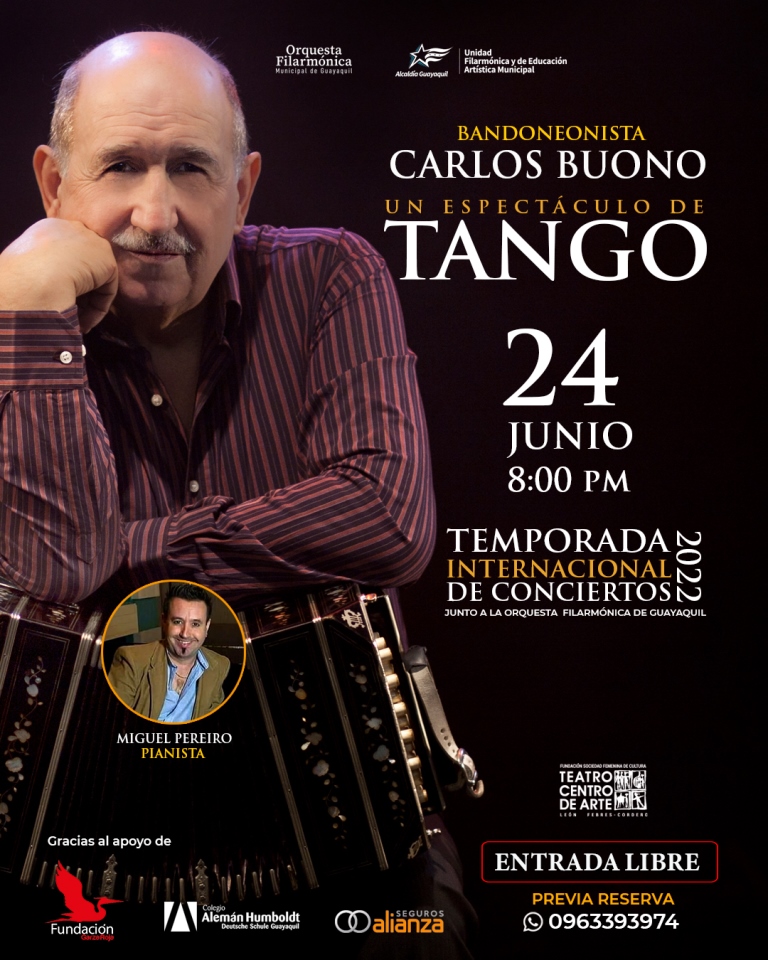 “Es una de las grandes figuras del tango, distinción que obtuvo en base a su talento, creatividad y perseverancia”. Así denomina la prensa de Argentina a Carlos Buono; pero él no se presentará solo, estará acompañado de Miguel Pereiro, pianista de la misma nacionalidad y que hace poco fue nominado a los famosos premios Grammy.