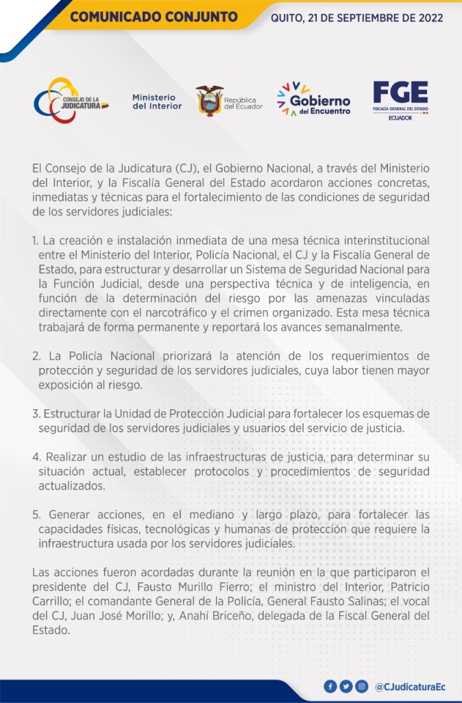 El día miércoles 21 de septiembre del 2022, en la sala y alrededor de la mesa de sesiones del Consejo de la Judicatura, en Quito, se reunieron: Fausto Murillo Fierro, presidente de este organismo; Patricio Carrillo, ministro del Interior; Fausto Salinas, comandante general de la Policía Nacional; Anahí Briceño, delegada por la fiscal general del Estado; y Juan José Morillo, vocal del Consejo de la Judicatura.