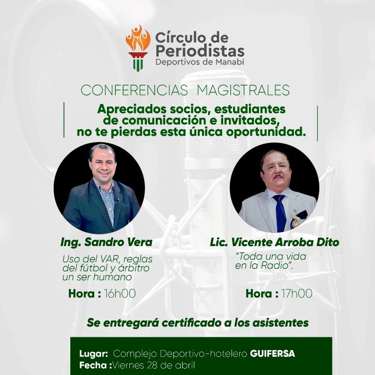 Los conferenciantes invitados, son: ingeniero Sandro Vera (uso del VAR, reglas del fútbol y la sensibilidad humana de quien arbitra); y, licenciado Vicente Arroba Dito, gerente-director de Radio Sucre (Guayaquil), que contará la experiencia de vivir “Toda una vida en la radio”.