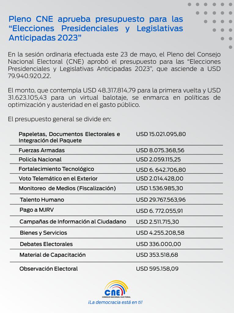 Las elecciones han sido fijadas para el día domingo 20 de agosto del presente año 2023 y su costo económico total se ha calculado en casi 80 millones de dólares de los Estados Unidos de Norteamérica (Ver PDF Presupuesto Electoral, adjunto).