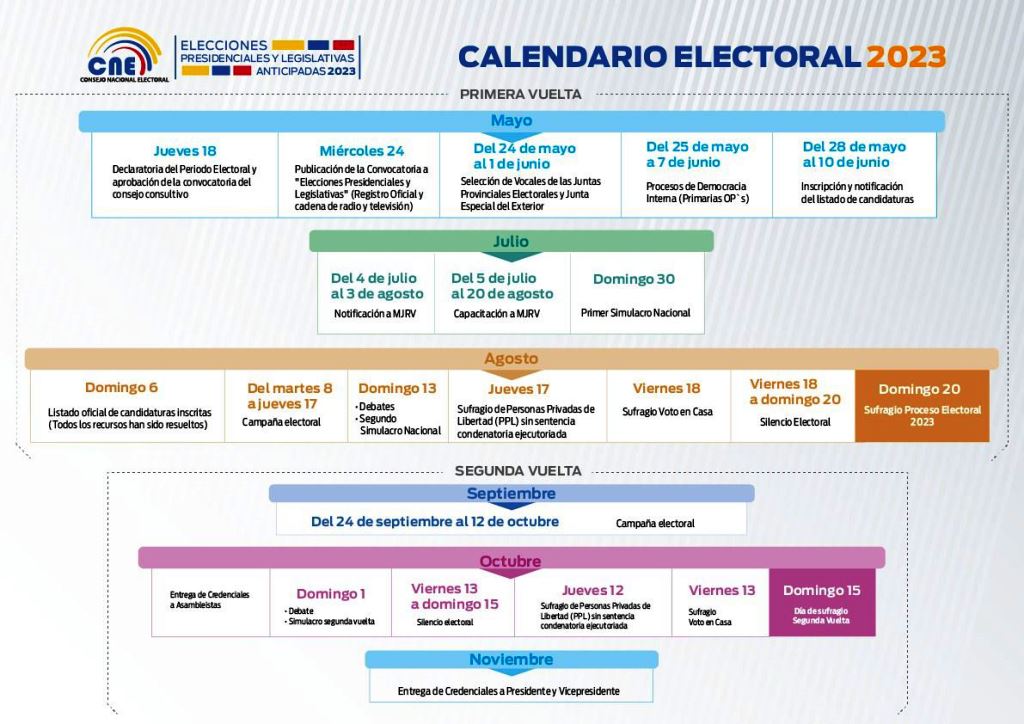 Ponemos a disposición de quienes leen REVISTA DE MANABÍ, el gráfico del CNE con el Calendario Electoral 2023 de las elecciones anticipadas de presidente o presidenta y vicepresidente o vicepresidenta de la República, y de asambleístas o legisladores de la Asamblea Nacional del Ecuador.