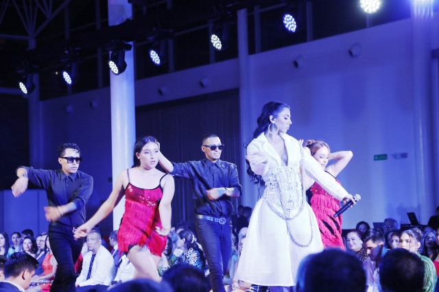 La velada tuvo momentos de musicalidad, entre un desfile y otro, con la actuación agradable de los artistas ecuatorianos Naomi V y Robertto Rubén y el Grupo de Danza Ático.