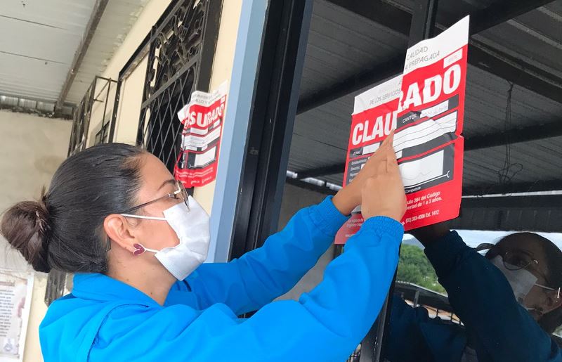 La comisaria provincial de la ACESS, Ab. Sandra Borrero Macías, procedió a la colocación de los sellos de clausura en las puertas de ingreso al establecimiento, pues este no contaba con permiso de funcionamiento ni con el licenciamiento respectivo que otorga la Agencia.