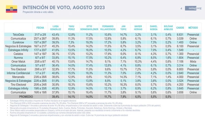 Una de las organizaciones encuestadoras aprobadas por el Consejo Nacional Electoral (CNE), identificada por su nombre Celag, ha sumado los pronósticos de todas las encuestas y confiere a la candidata manabita un promedio de casi el 40 % de la preferencia electoral, muy por encima de los otros siete candidatos varones.