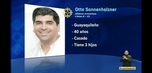 Daniel Noboa Azín y Xavier Hervas tuvieron el acierto de mostrarse imperturbables. Luisa González insistió en su aspiración de emular a su mentor y patrocinador, el expresidente Rafael Correa Delgado. Jan Topic, Yaku Pérez y Otto Sonnenholzner estuvieron eufóricos y trataron de parecer conocedores de la problemática ecuatoriana y de saber cómo resolverla. En tanto que Rafael Armijos dejó visible que compite en desventaja frente al poder económico y político de sus adversarios.
