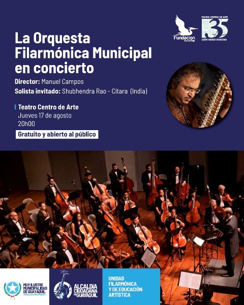 Un concierto de música clásica hindú tendrá lugar en el Teatro Centro de Arte de la ciudad de Guayaquil (Ecuador), el próximo jueves 17 de agosto del 2023 desde las 20h00. El acceso a la sala es gratuito, porque se trata de un evento patrocinado por el Gobierno cantonal de Guayaquil, la Orquesta Sinfónica y la privada Fundación Garza Roja de aquella ciudad.