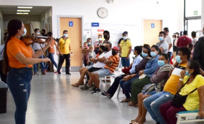 Artistas que hacen música con diferentes instrumentos recorren las salas de espera y hospitalización, interpretando melodías que ayudan a mejorar la salud mental y el bienestar general de los pacientes, mientras esperan atención médica en un ambiente de armonía y relax.