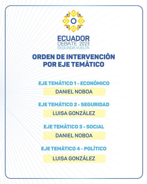 En cuanto al orden de discusión, Daniel Noboa iniciará las intervenciones de los bloques 1 y 3, correspondientes a los ejes Económico y Social; mientras que la candidata Luisa González iniciará los bloques 2 y 4, referentes a los ejes de Seguridad y Política.