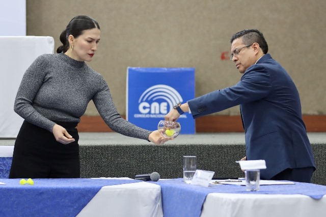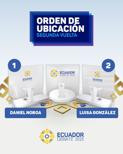 En el sorteo se definió que el candidato Daniel Noboa, de la Alianza Acción Democrática Nacional, ocupará el atril uno, al lado derecho de la moderadora. Mientras que la candidata Luisa González, del Movimiento Revolución Ciudadana, se ubicará en el atril dos, al lado izquierdo de la moderadora.