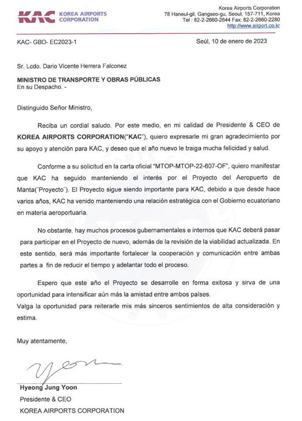 Al respecto, mencionan una comunicación del presidente y director ejecutivo de KAC, Hyeong Jung Yoon, dirigida el 10 de enero del 2023 al entonces ministro ecuatoriano de Transportes y Obras Públicas, Darío Vicente Herrera Falcones, en la que renueva el interés de aquella empresa por gestionar el aeropuerto de Manta.