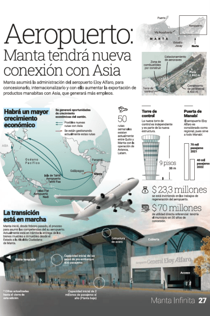 Participación en los beneficios económicos: El Comité Técnico Ciudadano de la Municipalidad de Manta confía en que la delegación del Aeropuerto Eloy Alfaro a la empresa coreana Korean Airport Corporation (KAC) traerá beneficios económicos directos para la ciudad y la provincia. De las utilidades proyectadas, el 10 % quedarían para Manta.