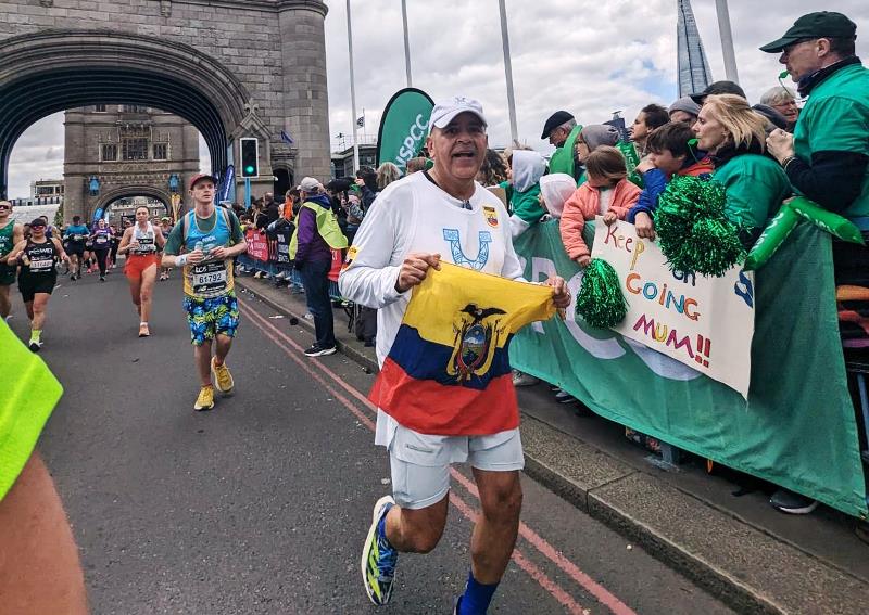 La silla manteña, estampada en la camiseta de dos emigrantes de Manta (Ecuador) que compitieron por afición, recorrió los 42 kilómetros de la competencia, considerada el evento atlético más importante de la capital británica.