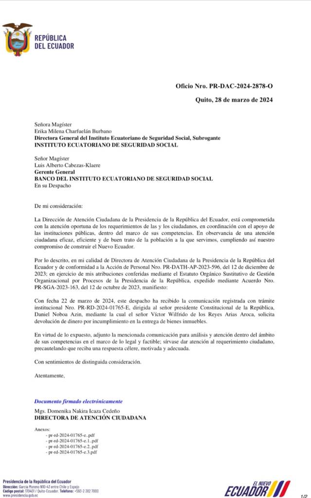 Arias da cuenta de una comunicación escrita, firmada por Domenika Nakira Icaza Cedeño, directora de Atención Ciudadana de la Presidencia de la República, y dirigida a Erika Milena Charfuelán Burbano, directora general subrogante del IESS, documento en el que se requiere todo el expediente de aquel plan habitacional.