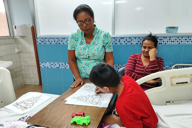 En el mismo caso está Mario C., quien junto a su mamá está desde el domingo 8 de diciembre/2024 en Pediatría. Él también recibió varias hojas con dibujos a los que dio color; y, mientras recibe su medicina a través de un suero, juega con varios carritos.