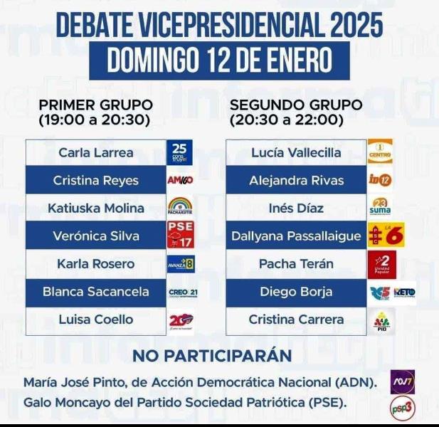 Esta noche (domingo 12 enero 2025), desde las 19h00 de Ecuador, los aspirantes a vicepresidente de la República debatirán sus propuestas ante radioyentes, televidentes y seguidores de redes sociales a través de Internet.