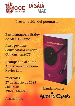 Tras experimentar situaciones domésticas inquietantes y un breve lapso de soledad perturbadora, el escritor y crítico literario Alexis Cuzme (Manta, Ecuador) vio la luz al final del túnel y se inspiró en sus propios trances, y en la tragedia de un músico famoso, resultando de todo ello un poemario, Fantasmagoría Staley, que ya ha merecido un reconocimiento institucional y será presentado al público el próximo miércoles 27 de agosto/2025.