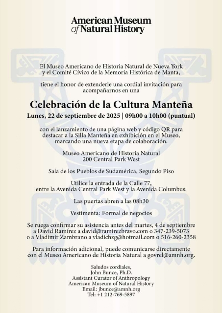 El día lunes 22 de septiembre/2025, en el Museo Americano de Historia Natural situado en la ciudad de Nueva York (EE.UU.), se activará para el público un código QR que permitirá acceder directamente a la historia de la Cultura Manteña.