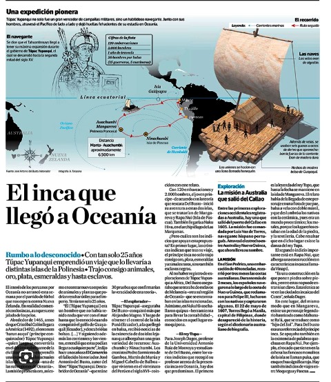 Revistas peruanas confirman el estupendo viaje que consistió en atravesar el Océano Pacifico, que todavía no se llamaba así, porque el estupendo conquistador que fue Vasco Núñez de Balboa, recién habría de bautizarlo con ese nombre en 1513, poco antes de que el inefable Pedro Arias Dávila ordenara que le corten la cabeza.