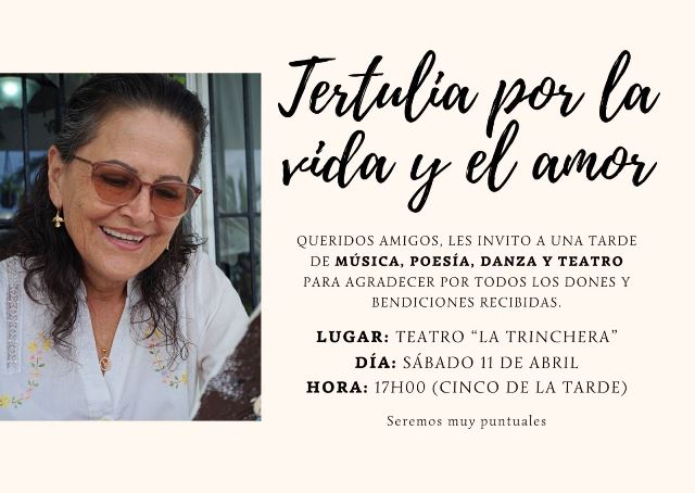 Precisamente de ahí ha surgido la idea de alentarla mediante una “Tertulia por la vida y el amor” a desarrollarse dentro del Teatro La Trinchera, en Barbasquillo, el próximo sábado 11 de abril del 2026 a partir de las 17h00 (Se anuncia y advierte que la función empezará puntualmente a esa hora).